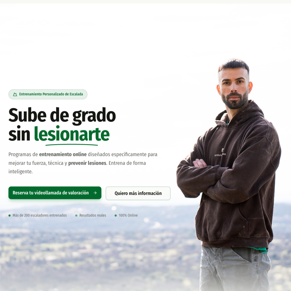 Web moderna para servicio de entrenamiento online de escalada con reseñas, integración de calendy y formularios de contacto.